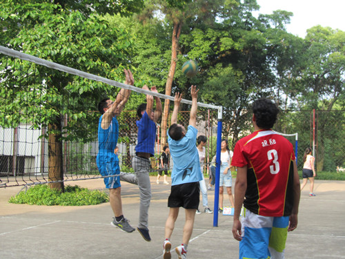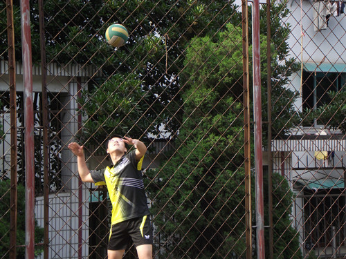 教职工队先声夺人,孔黎春老师开局就以漂亮的发球先得两分。接着,毕业生队的陈子清用扣球的假动作晃过教职工队的防守,将球一推,拿下一分;身高加弹跳,作为生化的“老牌战将”艾克的大力扣杀更是气势汹汹。凭借多变的球路、凌厉的进攻,毕业生队以25:14先得一局。