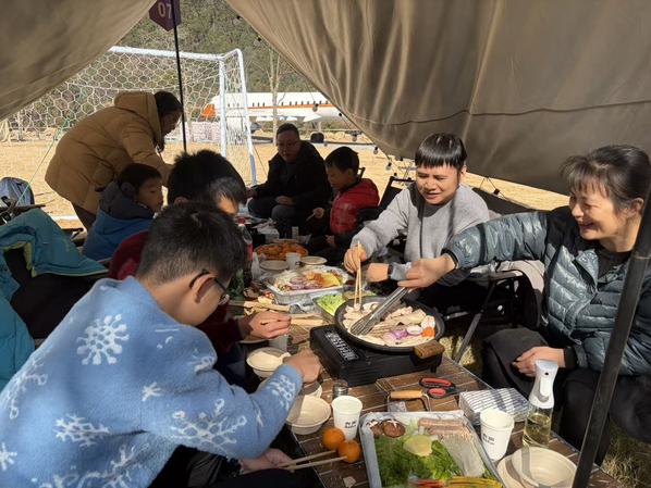 午餐时分,教职工们围坐在天幕下品尝自己烤制的美食和香喷喷的叫花鸡,欢声笑语不断。午后,营地趣味活动精彩纷呈,大家在草坪上体验了飞盘、踢足球、射箭等项目,你追我赶,默契配合,尽情释放工作的压力。活动尾声,全体教职工合影留念,用镜头定格这美好的一天。