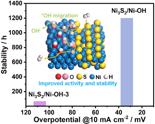 本研究利用氯化铵调控电解pH,一步合成由硫化镍和羟基化金属镍组成的异质结构(Ni3S2/Ni-OH)。这一创新性策略在驱动Ni3S2形成的同时,将Ni(OH)2转化为羟基化金属镍(Ni-OH),因而显著降低了电析氢中间体羟基在催化剂表面迁移的能垒和水分子裂解能垒,促进了活性位点的持续再生,最终增强了催化剂的电解稳定性和活性。实验结果表明Ni3S2/Ni-OH催化剂表现出色,在电流密度为10 mA cm-2时仅需过电位33 mV,显著低于对比样Ni3S2/Ni-OH-3(108 mV)和S-Ni(OH)2(172 mV),在长达1200 h的恒电位测试中电流密度几乎无衰减。远超对比组的Ni3S2/Ni-OH-3(65h后电流保持率仅为63%)和Ni-OH(65h后电流保持率仅为64%)。当将Ni3S2/Ni-OH作为阴极与高性能阳极(NiFe-LDH)组装成碱性阴离子交换膜电解槽时,该系统仅需1.77 V电压即可驱动200 mA cm-2的电流密度,并在该电流密度下稳定运行1000h。此外,通过重新启动,AEMWE的性能可以完全恢复,进一步证实了Ni3S2/Ni-OH的强大稳定性,突显出在实际工业制氢中的可靠潜力。该研究揭示了“表面羟基化-稳定性/活性”之间的构-效关系,为设计兼具高稳定性和活性的电解制氢催化剂提供了全新思路。