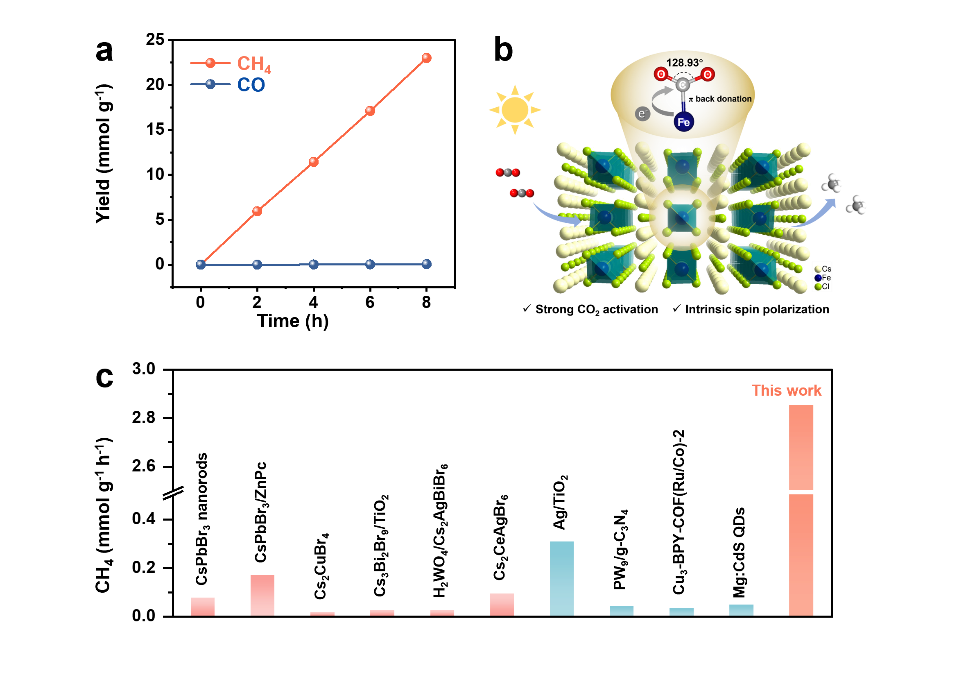 根据以上思考,团队采用配位结构调控与自旋极化协同的策略,设计并合成了无铅Cs3FeCl5纳米晶,用于可见光驱动的CO2还原。实验与理论计算均表明,该材料具有本征自旋极化特性,可有效抑制载流子复合;同时,其四配位Fe2+中心通过强d–p轨道耦合与CO2发生相互作用,显著降低活化能并稳定*COOH关键中间体,从而促进CH4生成。在模拟太阳光下,Cs3FeCl5纳米晶实现了接近100%的CH4选择性,CO2至CH4的光催化产率达到2.88 mmol g⁻¹ h⁻¹,性能优于目前大多数已报道的单组分光催化剂。
