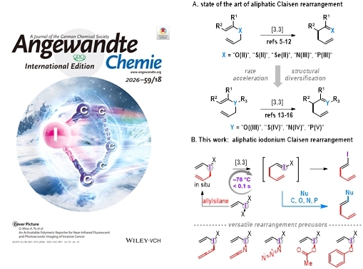 近日,彭勃/黄鑫团队在重排化学领域取得突破性进展。相关成果“Millisecond Aliphatic Iodonium‐Claisen Rearrangement Enabling Dual Functionalization of Alkenyl Iodanes”作为封面文章和Hot Paper在国际权威综合性化学期刊Angewandte Chemie上发表(Angew. Chem. Int. Ed. 2026, e202526108.)。